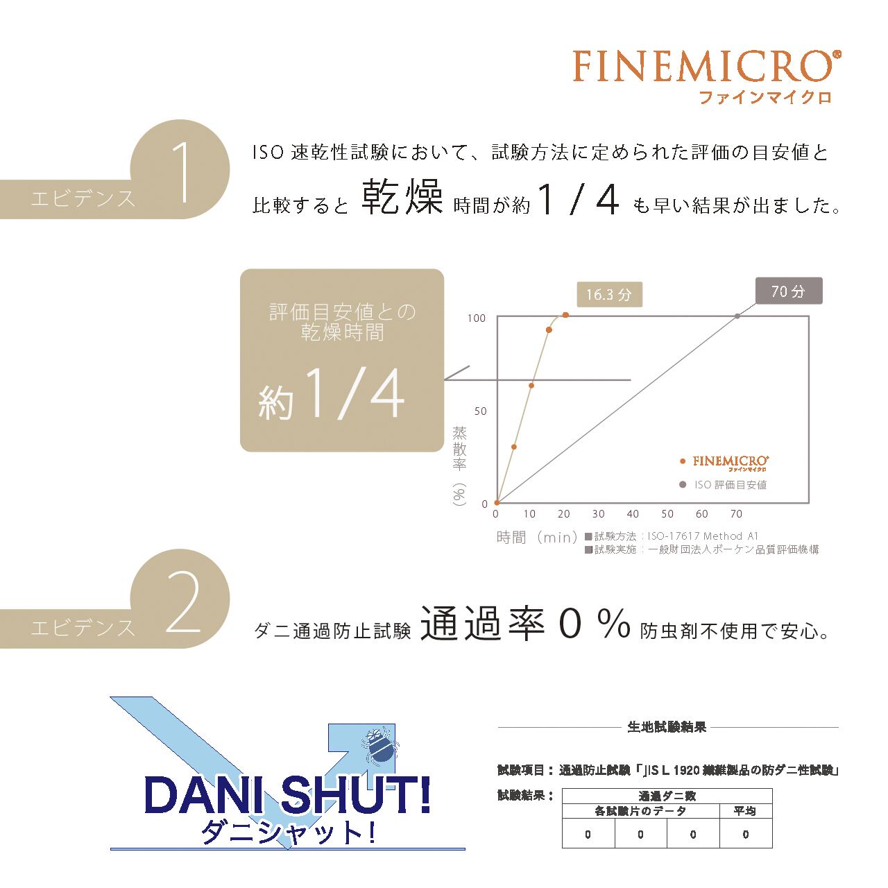 ISO速乾性試験において、試験方法に定められた評価の目安値と比較すると乾燥時間が1/4強も早い結果が出ました。吸水速乾”ファインマイクロ®︎”素材は、毛細管現象により高い吸水性と蒸散性を発揮します。