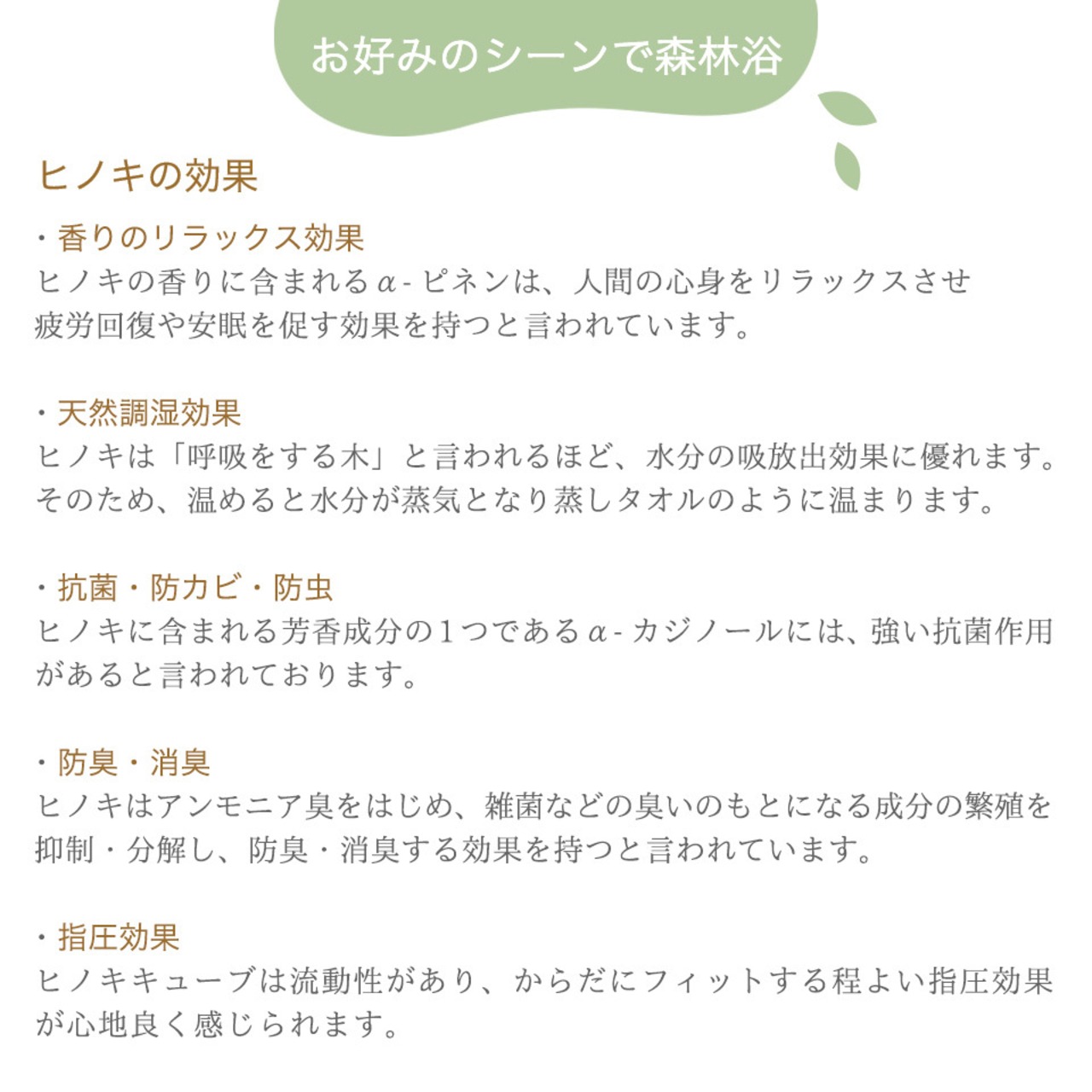 ヒノキの香りに含まれるα-ピネンは、人間の心身をリラックスさせ疲労回復や安眠を促す効果を持つと言われています。