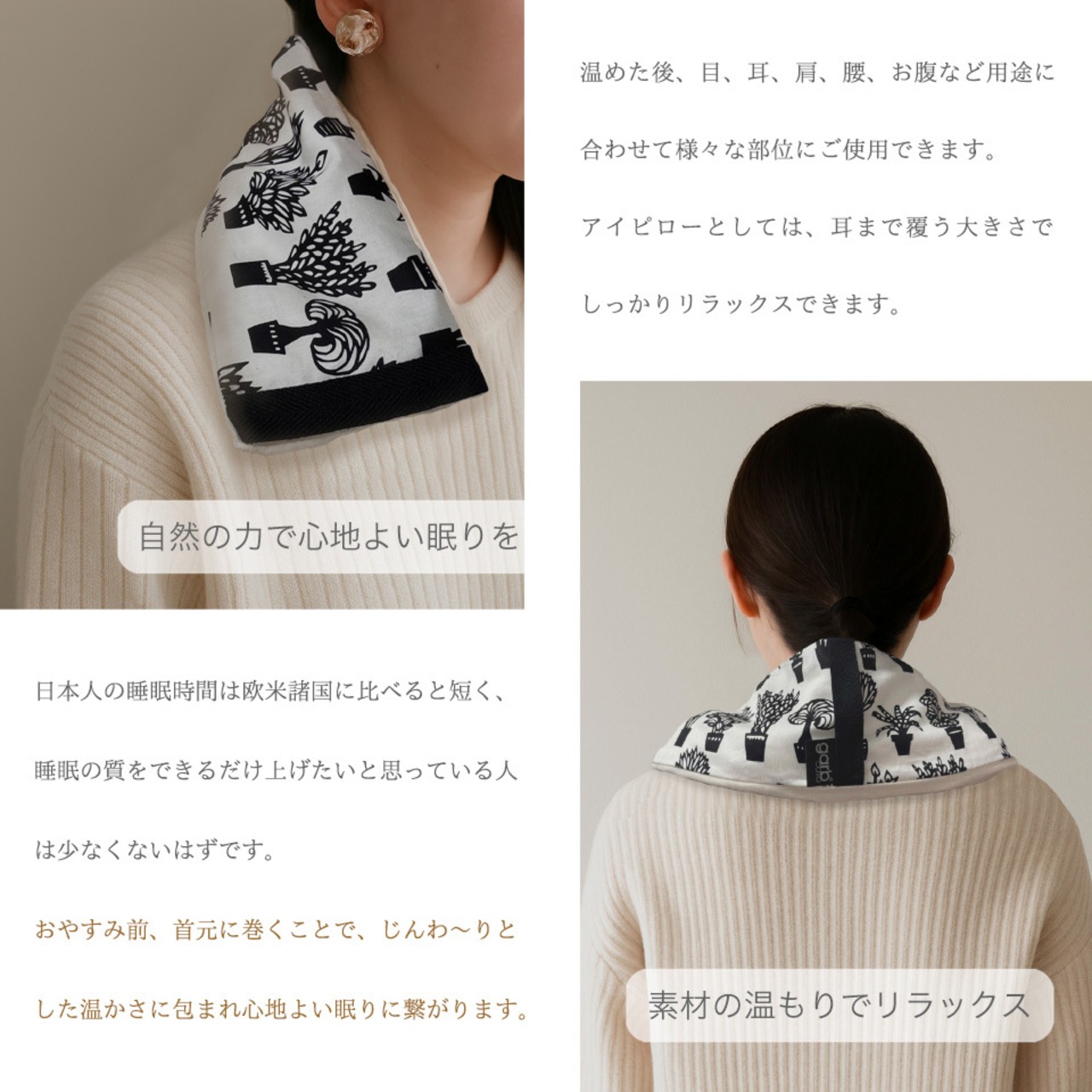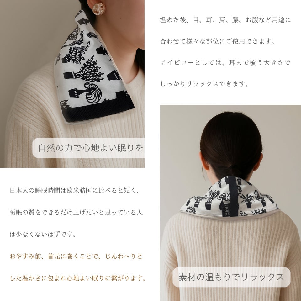 冬は首に巻いて布団の中に入ることで、熱すぎず適度な温もりが心地よい眠りを誘います。