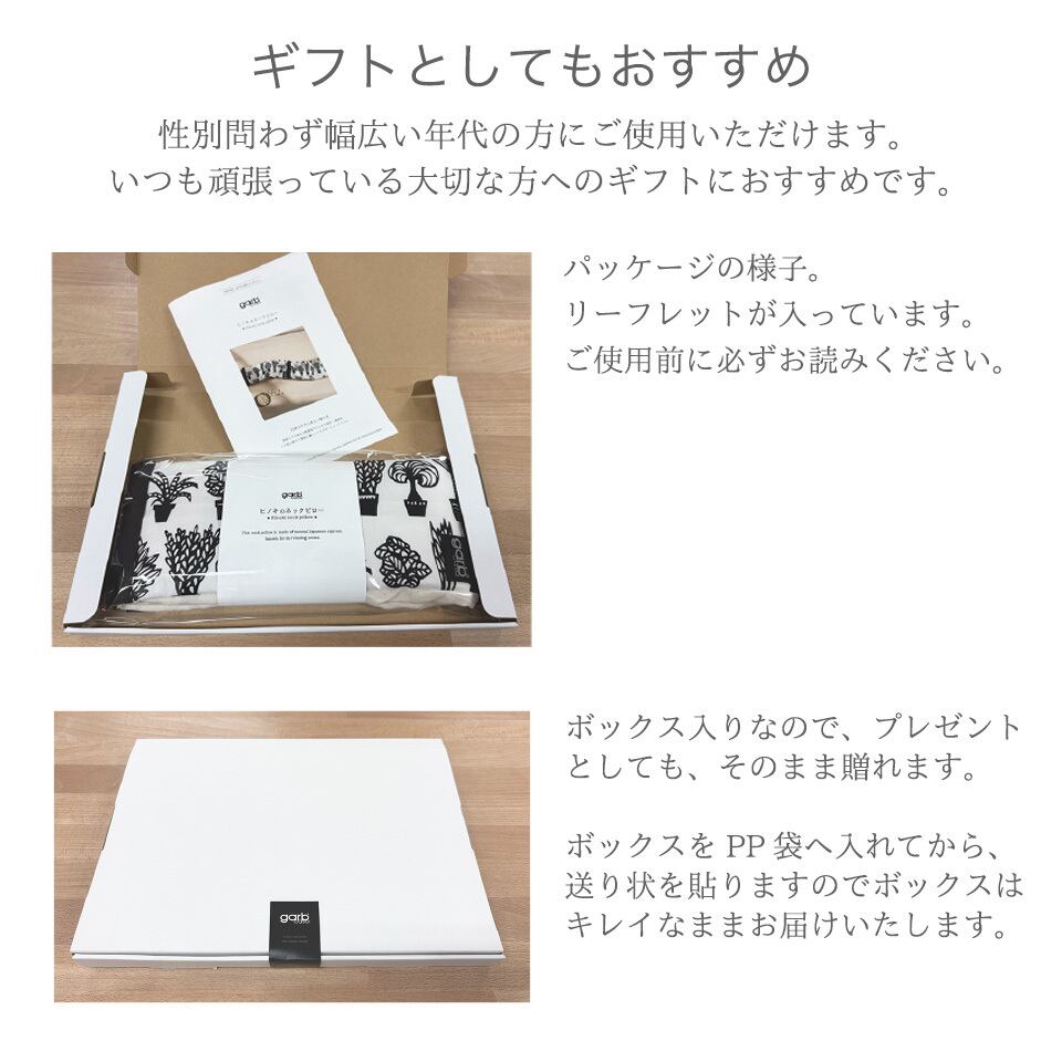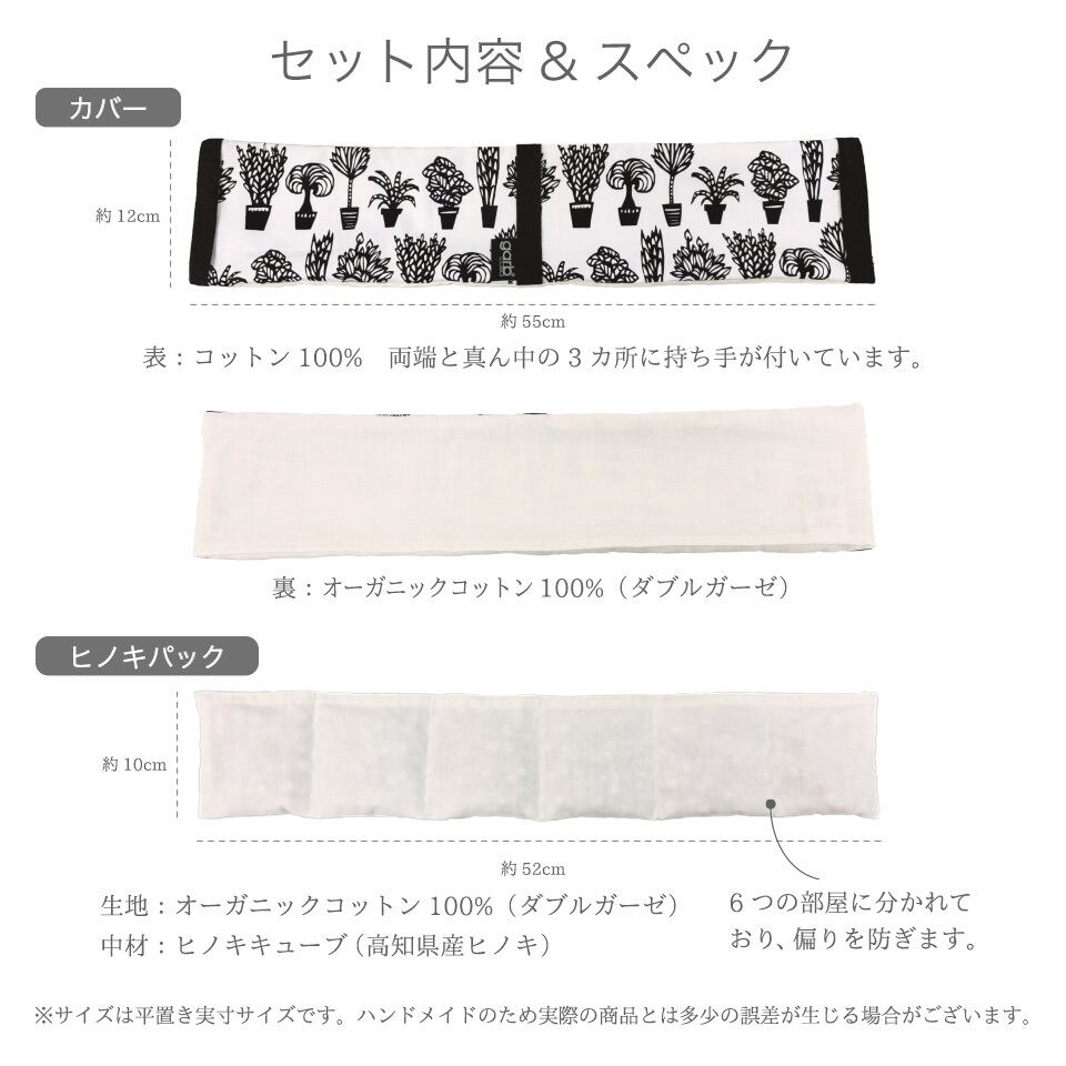 ヒノキパックにもオーガニックコットンのダブルガーゼ使用。肌触りがよく、ヒノキの蒸気がよく通り、森の中にいるような心地よい香りに包まれます。